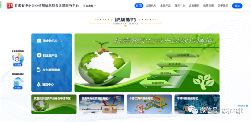 工作要求,积极发挥“陇信通”平台金融基础设施作用,利用“陇信通”平台线上融资对接功能,开辟抗震救灾信贷产品绿色申请专区,已上线36款信贷产品,加快响应速度、缩短融资时间、提高融资效率,全力以赴做好征信服务工作,在抗震救灾中体现金控大爱、征信担当,贡献金融力量。