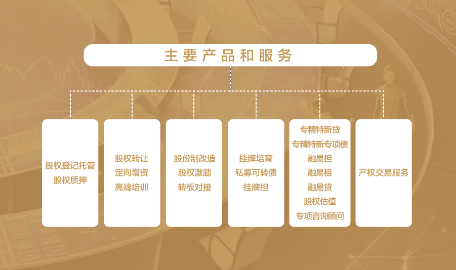 经营范围包括:为非上市企业的股权登记、托管、转让、交易、融资、结算、过户、分红、企业规范、培育等提供场所和服务;组织和监督股权托管交易活动;发布市场交易信息;为非上市公司进场挂牌提供融资、咨询等综合服务;为各类企业提供股权转让及增资扩股、实物资产、债权、不良资产和集中采购等产权交易业务服务,以及政策咨询、方案设计、项目推介、资产尽调等增值服务。