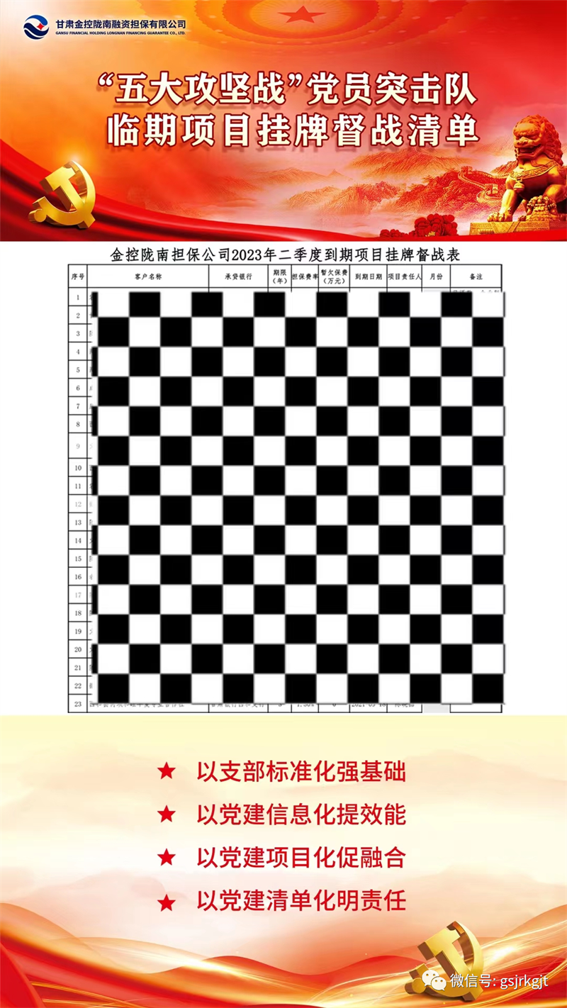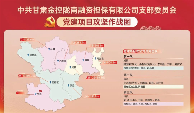 为扎实推进“三抓三促”行动,全面落实集团党委党建标准化、信息化、项目化、清单化建设要求,以高质量党建引领高质量发展,金控陇南担保创新“1+2+5”工作模式,全面打响党建项目化攻坚战。
